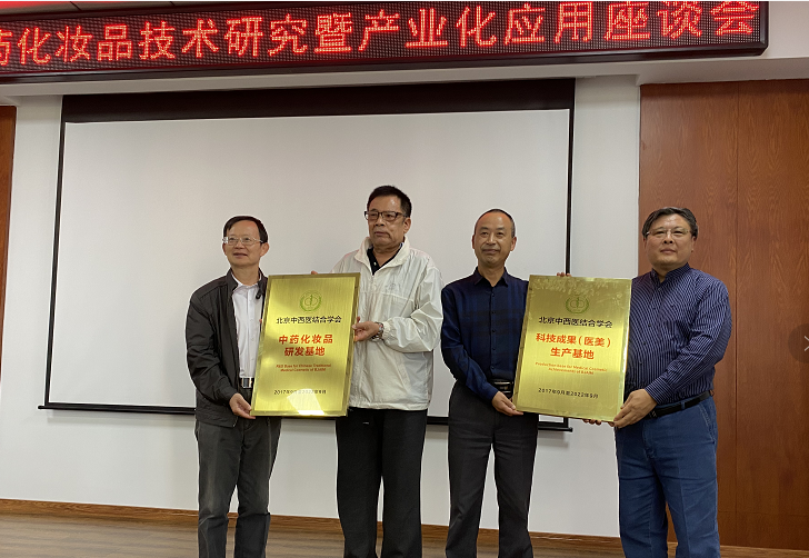 會(huì)上,轉(zhuǎn)化委專家組組長(zhǎng)李博鑑、主任委員戰(zhàn)嘉怡代表北京中西醫(yī)結(jié)合學(xué)會(huì)分別向荷琇公司授予《中藥化妝品研發(fā)基地》、《科技成果(醫(yī)美)生產(chǎn)基地》牌匾。